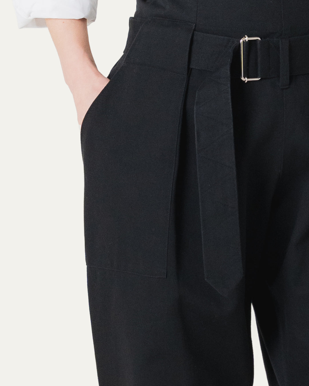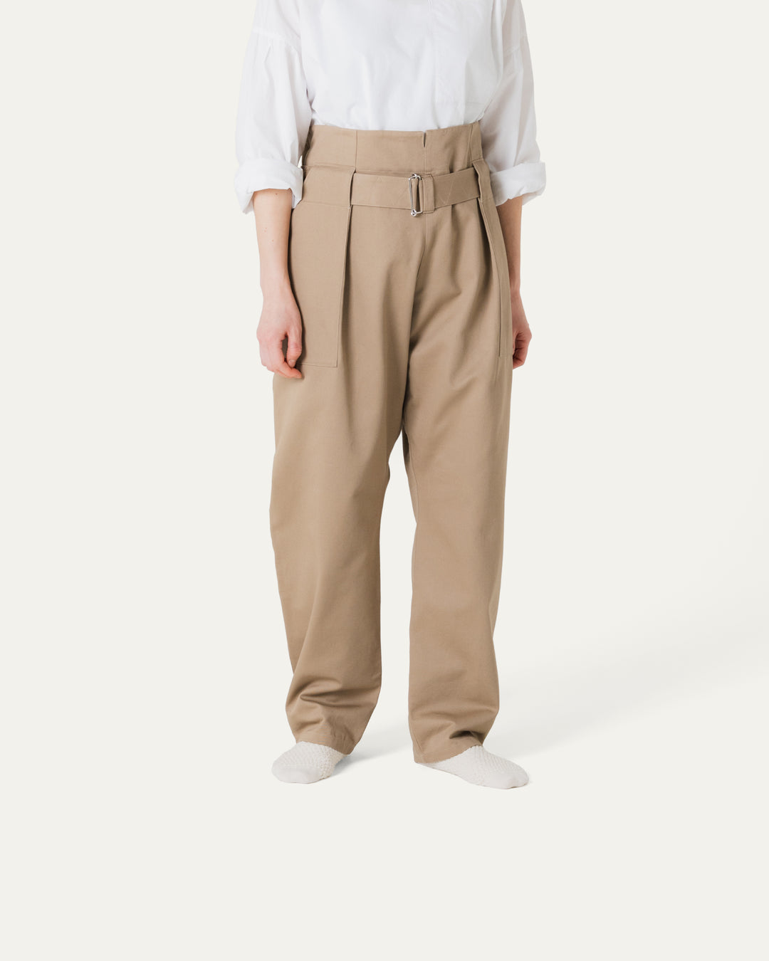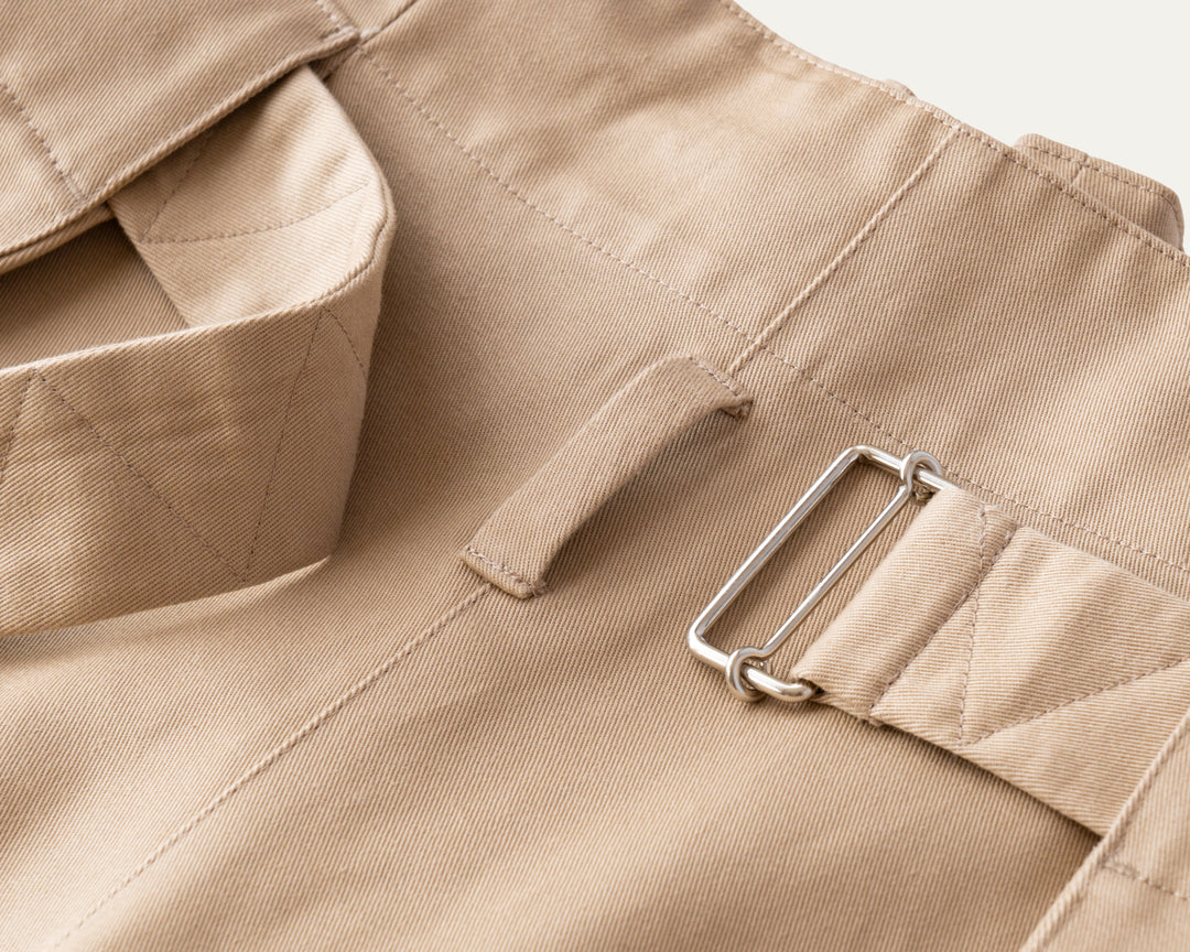 脇のボタンホール付きゴムで、ご自身の体型に合わせてサイズ調整。ポケットと一体となったベルトループを骨盤の位置に。最後にベルトで安定させて。お腹前面の生地を、後ろにぐっと寄せるように整えると綺麗に見えます。